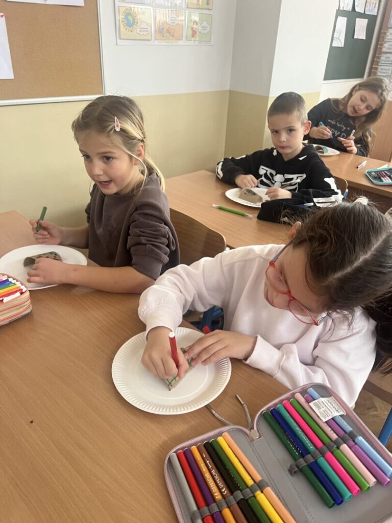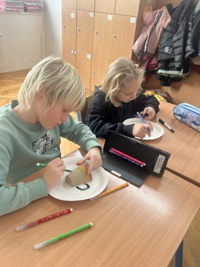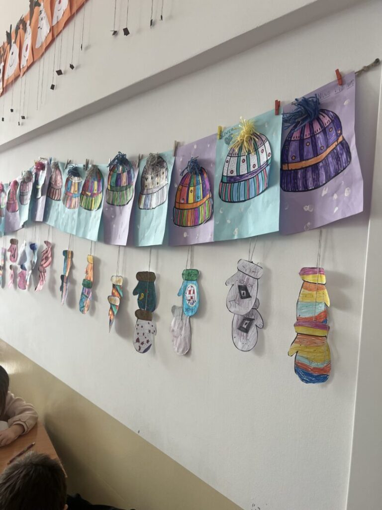 Najprije smo crtali kape i rukavice. Pažljivo smo ih ukrašavali raznim uzorcima – crtali smo srca, zvjezdice, pruge i pahuljice. Koristili smo različite boje kako bi naši radovi bili što veseliji. Kada smo završili bojanje, uzeli smo škare i pažljivo ih izrezali. Bilo je važno biti precizan, ali i strpljiv.