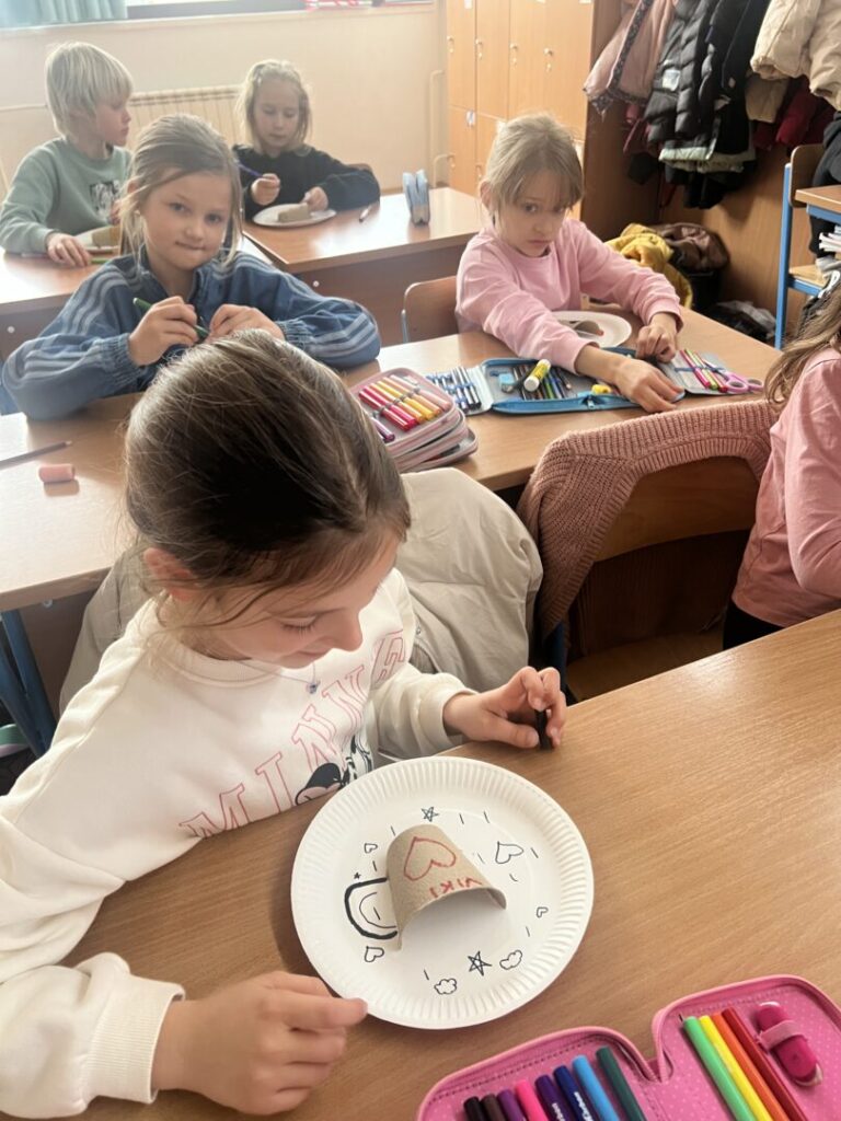 Nakon toga smo izrađivali šalice toplog čaja i vruće čokolade. Naše šalice bile su raznih oblika i veličina. Neki su nacrtali paru koja izlazi iz šalice, a neki su dodali i male detalje poput kolačića ili slatkiša. Bojali smo ih toplim bojama kako bi izgledale kao da nas zaista griju.