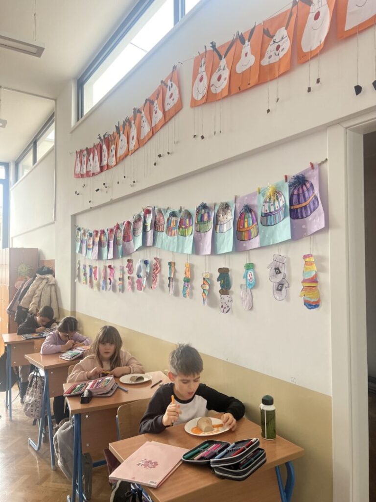 Na kraju smo sve radove zalijepili na pano. Kada smo pogledali našu učionicu, izgledala je kao prava mala zimska galerija. Bili smo ponosni na ono što smo napravili i sretni što smo zajedno proveli tako lijep i kreativan dan.